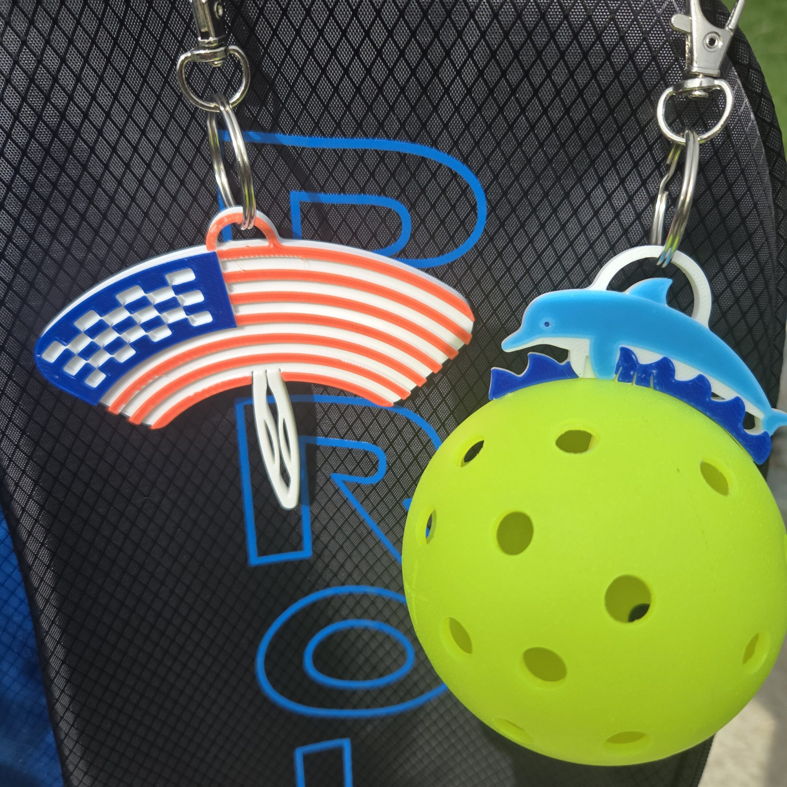 Dolphin & American Flag! Fun and Functional ball holder! Key chain included.